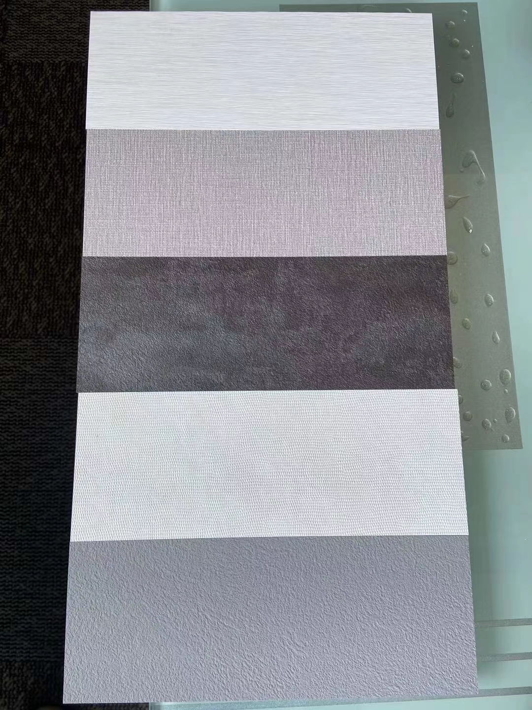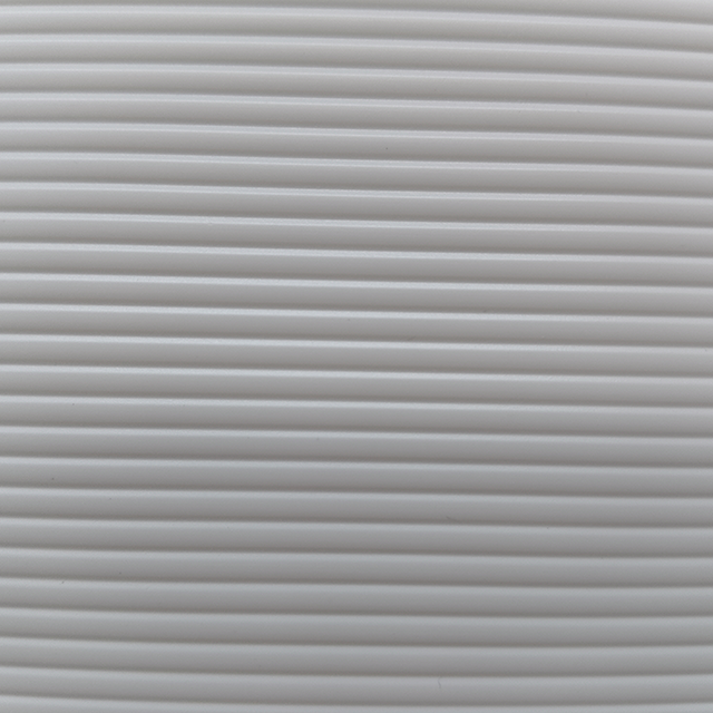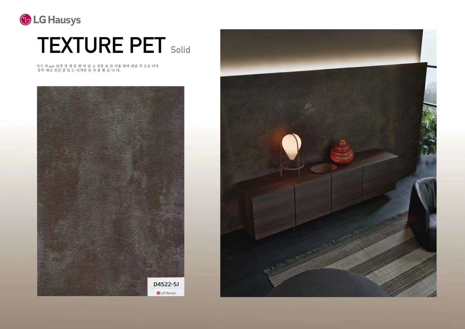Se aplica un relieve profundo al color sólido de PET que se usó solo para muebles, lo que ilustra una rica realidad en el exterior. Se crea un ambiente elegante en la superficie al transformar el brillo único del PET en un diseño mate.