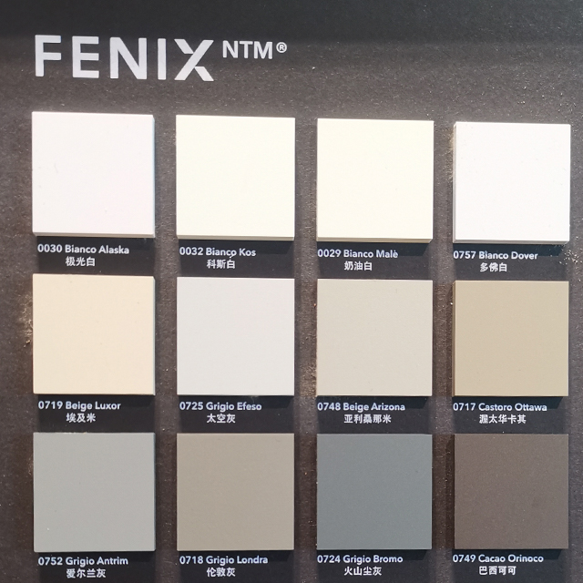 Aplicando tecnologías patentadas, la superficie externa de Fenix ​​se caracteriza por el uso de resinas acrílicas de próxima generación, endurecidas y fijadas mediante un proceso de curado por haz electrónico.   Con baja reflectividad de la luz, la superficie del Fenix ​​es extremadamente opaca, suave al tacto y antihuellas.   También es posible la curación térmica de microarañazos superficiales.   Hay Dos Tipos De Materiales Disponibles:Fenix ​​Ntm Y Fenix ​​Nta.